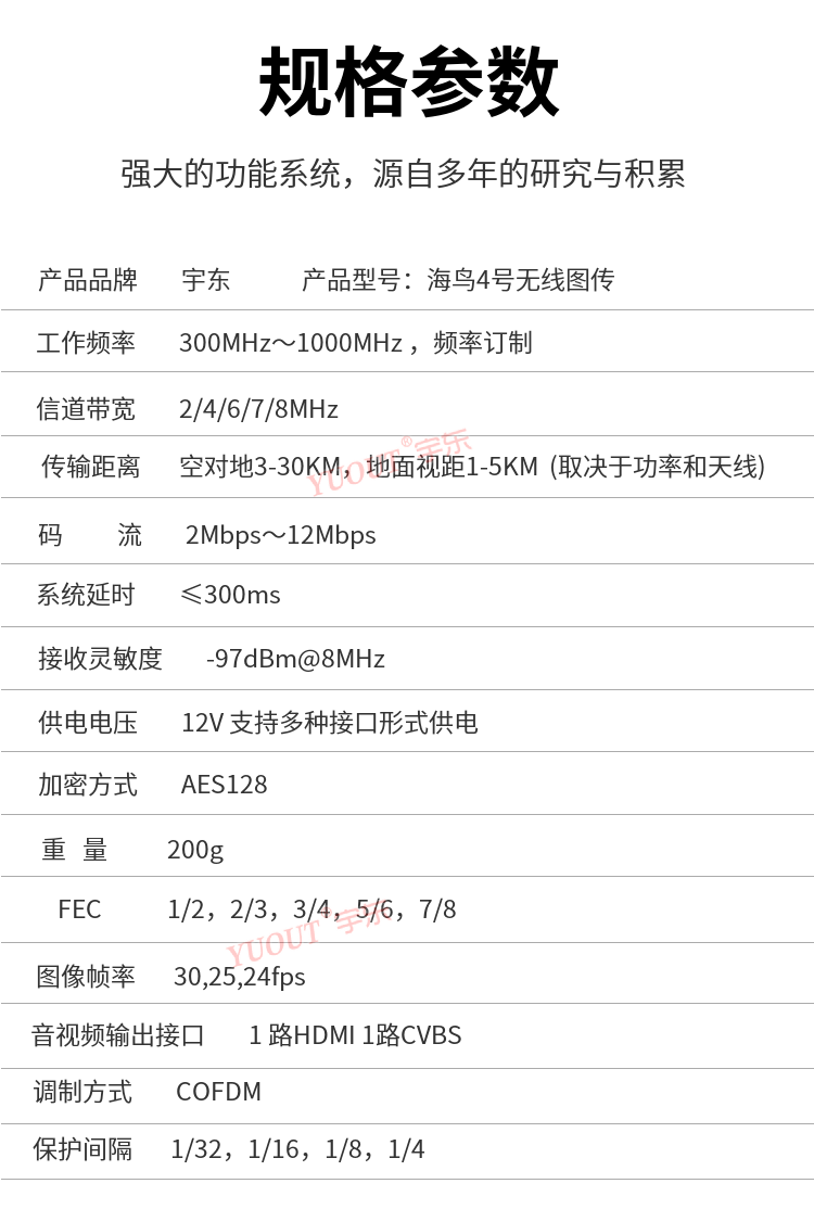 宇東海鳥(niǎo)4號(hào)無(wú)線圖傳高清微型無(wú)線視頻傳輸系統(tǒng),采用Coded Orthogonal Frequency Division Multiplexing:編碼正交頻分復(fù)用調(diào)制技術(shù),具有傳輸頻帶窄、很強(qiáng)的抗多徑干擾能力和抗多徑衰落能力,能夠?qū)崿F(xiàn)非視距(NLOS),高速運(yùn)動(dòng)情況下實(shí)時(shí)傳輸高質(zhì)量圖像。