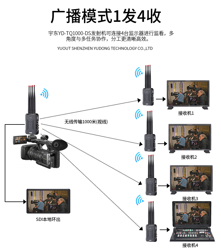 YD-TQ1000-DS是由發(fā)射端和接收端組成,支持3G/HD/SD-SDI或者HDMI 1080P全高清信號(hào)傳輸,作為圖傳時(shí),視線無阻擋傳輸距離1000至1500米。頻段采用5.1-5.8GHz,支持用戶手動(dòng)通信頻點(diǎn)調(diào)整,為發(fā)射端和接收端配對(duì),還支持廣播模式,可以把多個(gè)接收端設(shè)置成跟一個(gè)發(fā)射端相同的頻點(diǎn),實(shí)現(xiàn)一發(fā)多收。純硬件連接操作,簡(jiǎn)單可靠。設(shè)計(jì)精巧,可以F970 、V口、 電源適配器三種供電方式,方便移動(dòng)拍攝。廣泛應(yīng)用于電影拍攝、應(yīng)急搶險(xiǎn)、消防、人防、武警、突發(fā)事故單兵視頻采集等場(chǎng)合;真正實(shí)現(xiàn)高清無線傳輸、移動(dòng)實(shí)時(shí)傳輸、