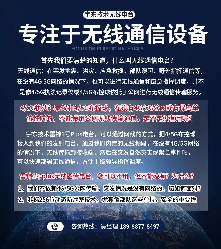 宇東技術(shù)雷神1號PLUS背負(fù)式高清無線圖傳電臺,是公司針對應(yīng)急救援指揮、公安、反恐作戰(zhàn)、消防救援、邊防執(zhí)勤、海警海關(guān)巡檢、部隊(duì)拉練演習(xí)、森林消防等,在突發(fā)重大事件,斷網(wǎng)斷電,通信中斷的情況下,現(xiàn)場工作人員通過宇東雷神1號PLUS單兵圖傳電臺,把現(xiàn)場采集的數(shù)據(jù)實(shí)時(shí)無線傳輸?shù)街笓]車/臨時(shí)指揮部大屏幕,讓指揮部領(lǐng)導(dǎo)對現(xiàn)場情況一目了然,節(jié)省了到達(dá)現(xiàn)場的時(shí)間,可快速做緊急指揮調(diào)度,最大限度的減少突發(fā)事件帶來的各種損失。