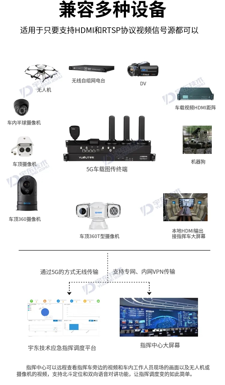 YD-GB8010-1U產品采用H.265超高壓縮算法,無線網絡自適應視頻編碼和傳輸技術,最大限度地有效利用傳輸帶寬,保證視頻傳輸的清晰度和流暢性,在無線網絡帶寬不是很穩定的環境下,傳輸效果遠超國內外同類產品。設備基于先進的H.265視頻編碼技術和5G無線信道捆綁傳輸技術開發的新一代產品。支持5G+4G網絡捆綁模式,可捆綁兩張不同運營商數據卡鏈路同時工作。解決了目前5G前期覆蓋盲點較多的問題,真正實現了5G/4G完美融合(5G+4G多卡為選配,標配為5G單卡)